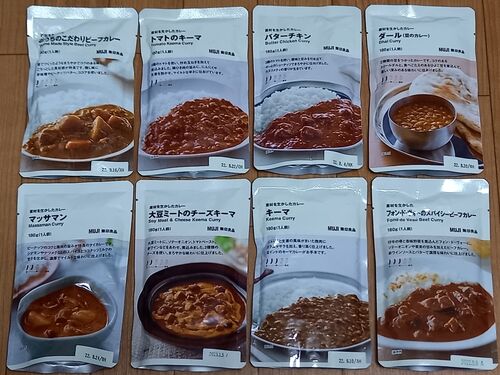 今日は無印良品でレトルトカレーを買ってきました。週に1回程度のペースでレトルトカレーを食べています。 無印良品のカレーは初めて食べます。 たくさん種類があったのですが、とりあえず8種類買ってみました。 好みに合うカレーがあるといいなと思います。