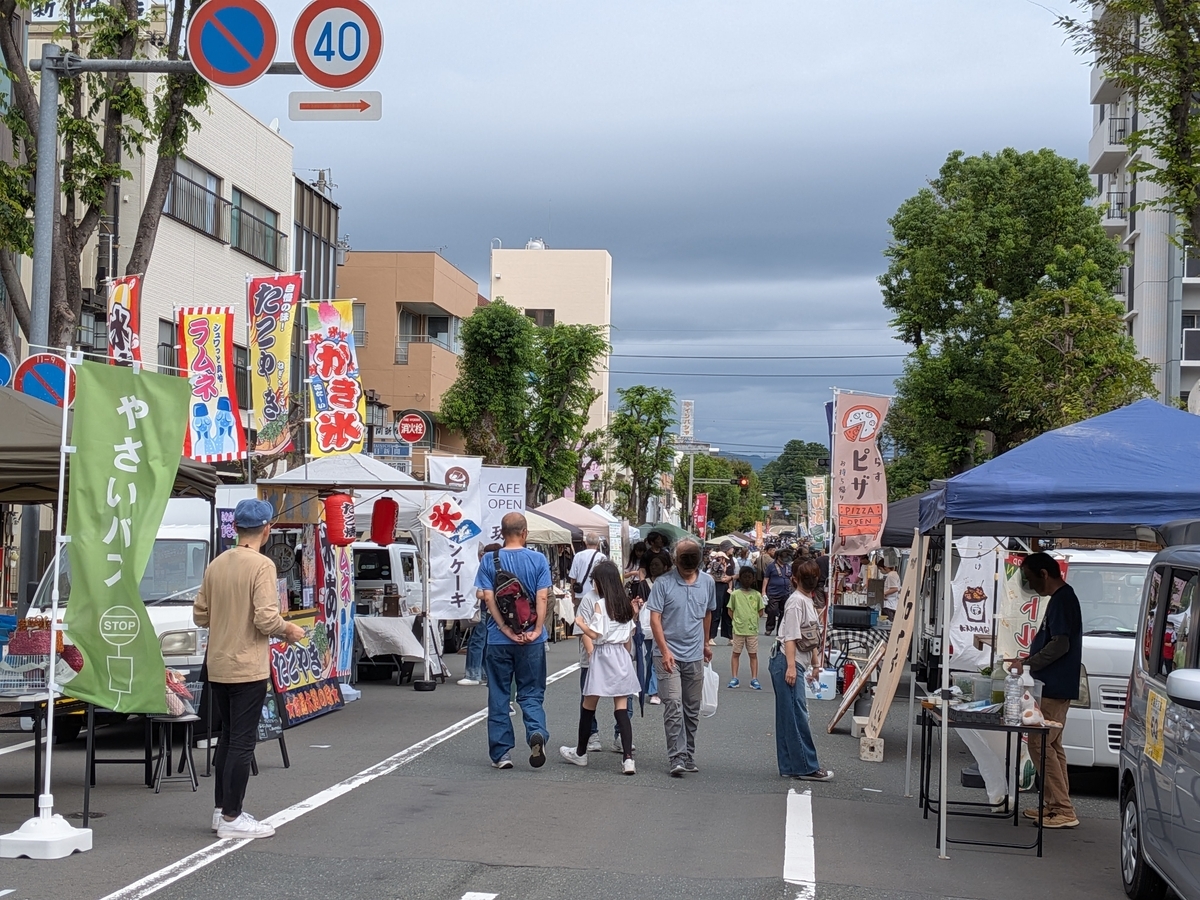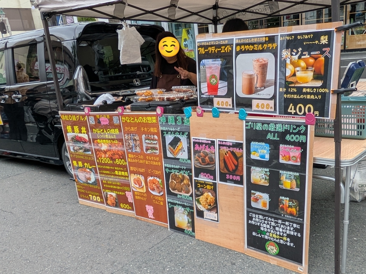 掛川駅北口 駅前通り(静岡県掛川市)を歩行者天国にして、軽トラックやブースによる路上販売が行われていました。