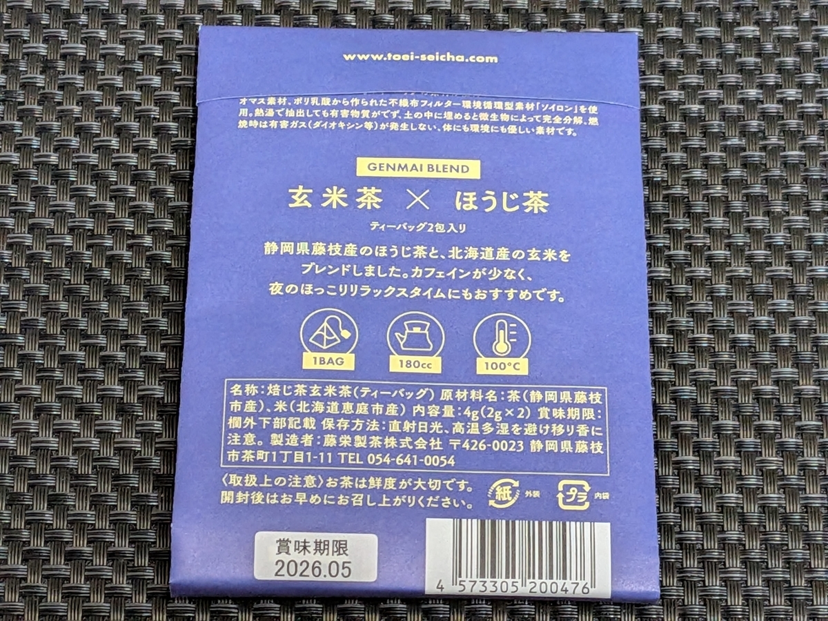静岡県藤枝産のほうじ茶と、北海道産の玄米をブレンドしたそう。