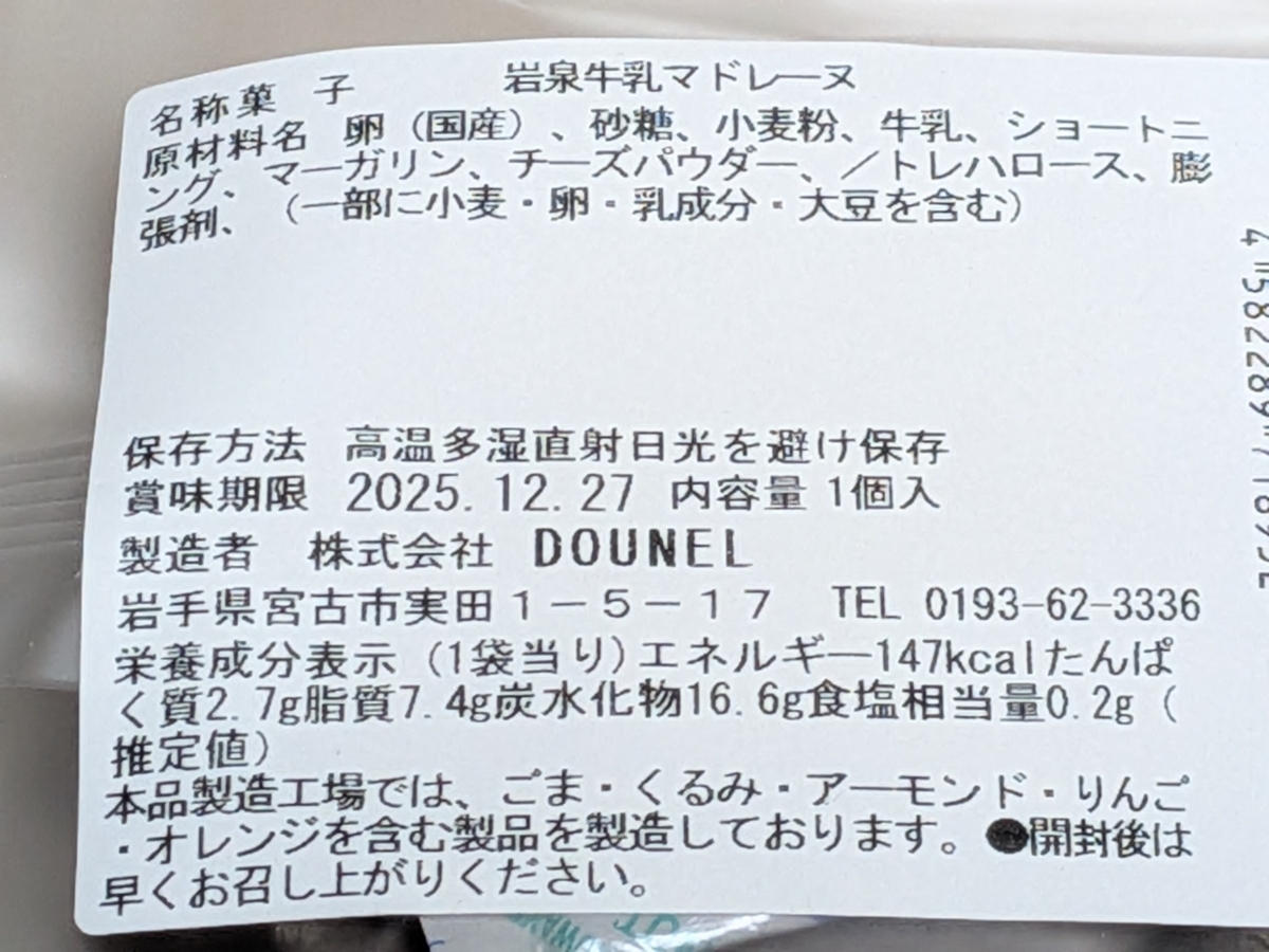 岩泉牛乳マドレーヌ。