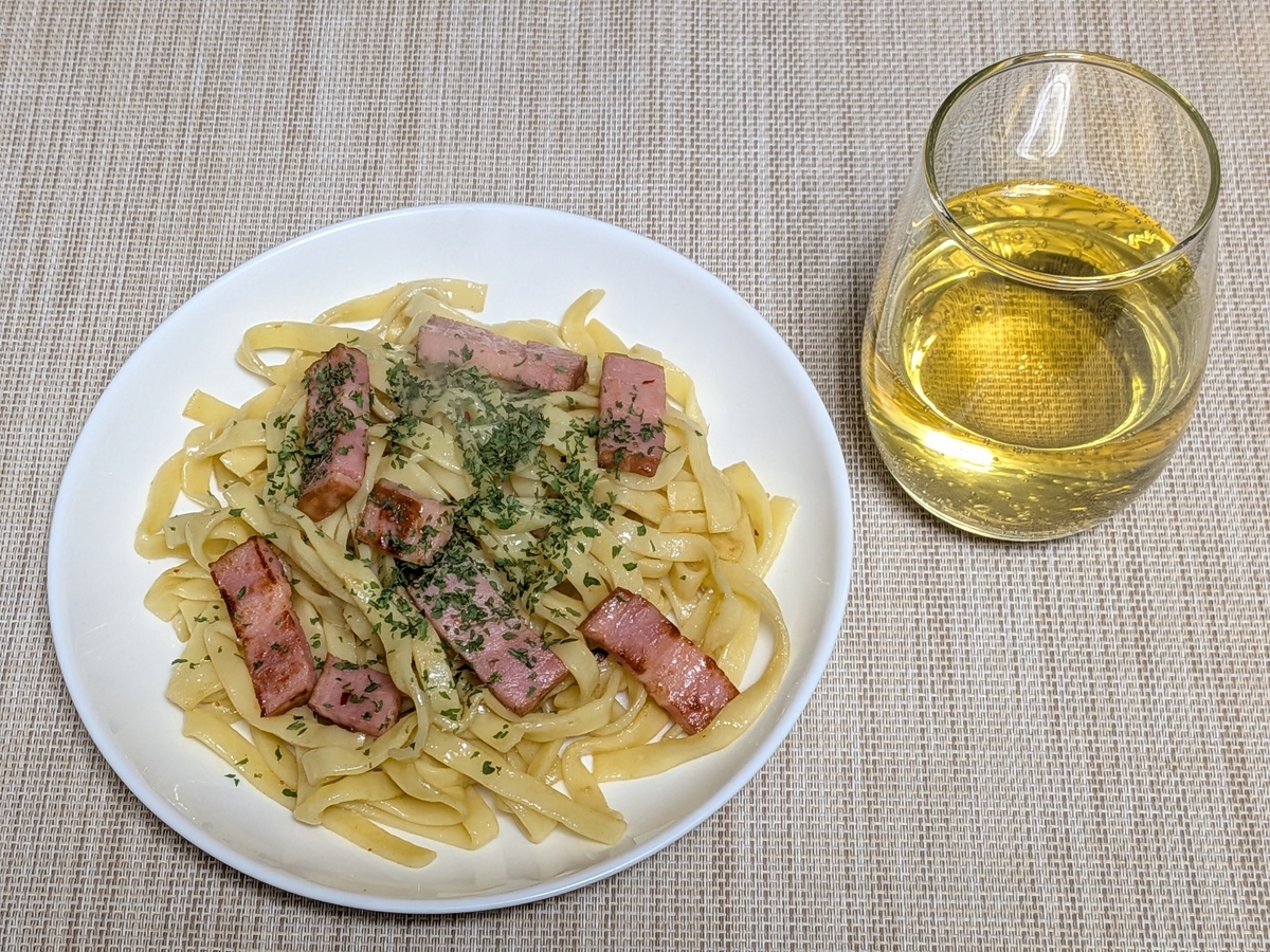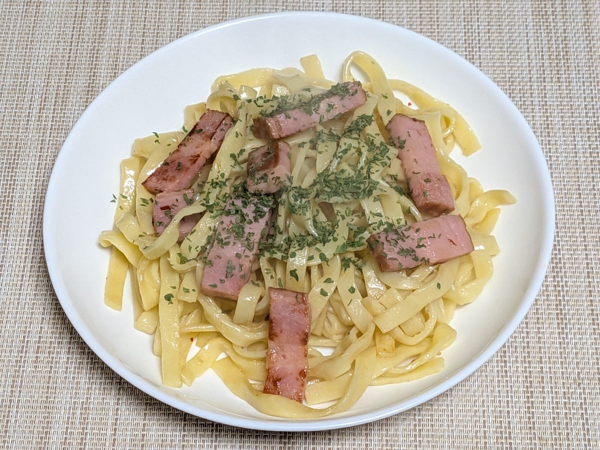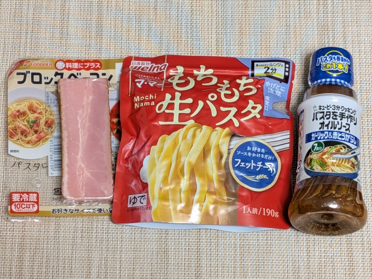パスタは袋のまま電子レンジで加熱できるもちもち食感のゆでパスタ、㈱日清ウェルナの「マ・マー もちもち生パスタ フェットチーネ」を、パスタソースはキューピー㈱の「パスタを手作りオイルソース ガーリック&赤とうがらし」を使って、ブロックベーコンと一緒に炒めて、乾燥パセリを散らしました。