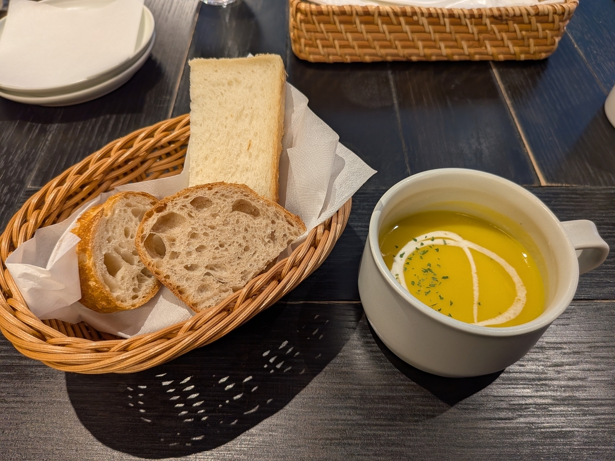 お代わり自由のかご盛りパンと季節のスープ付き。